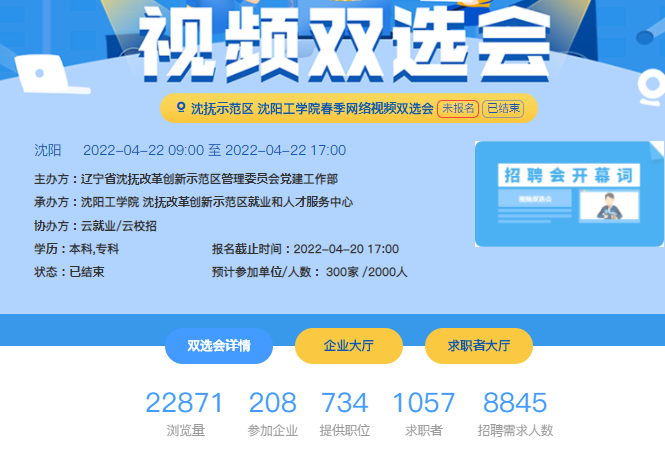 本次网络视频双选会共吸引208家省内外用人单位参加,其中世界500强12家、中国500强17家、上市公司33家、民企500强12家、行业500强19家、国有企业16家,提供职位734个,需求人数8845人,招聘行业覆盖了学校所有毕业生专业。